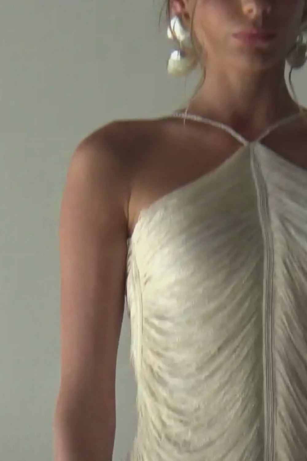 This stunning mini dress is handcrafted with delicate fringe that drapes beautifully over your figure over a transparent mesh lining, creating a mesmerizing silhouette.