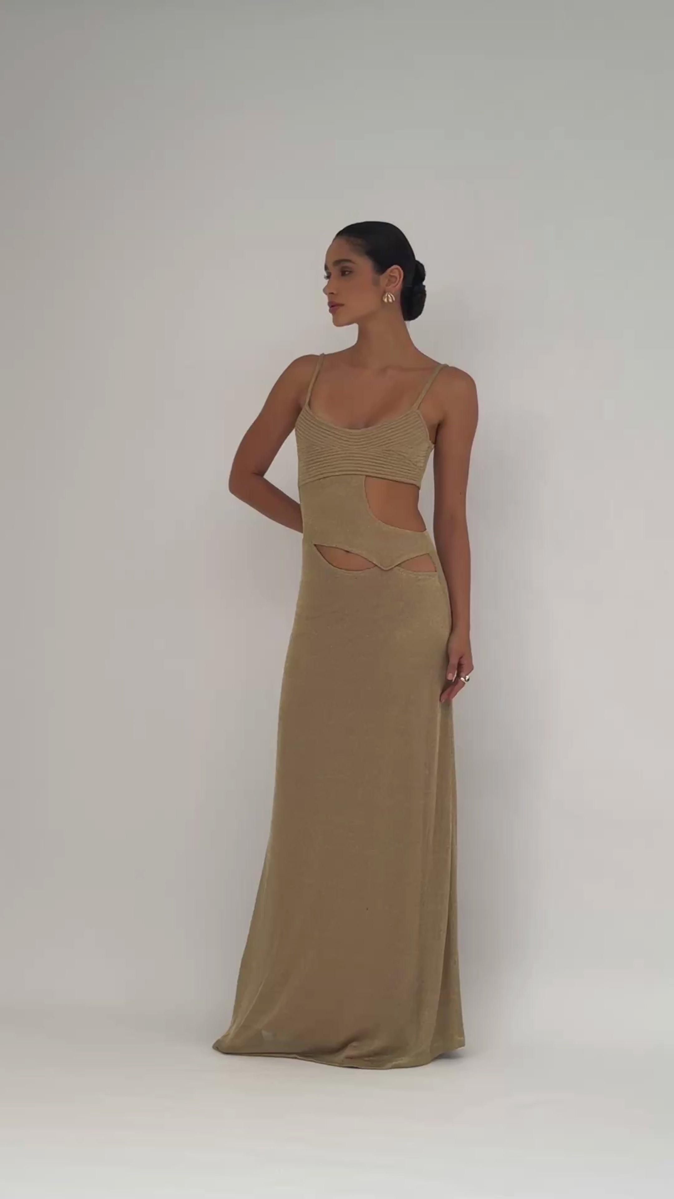 Crafted for balmy nights and golden hour moments, the Lumen Dress is an ethereal piece that captures the essence of summer glamour. Made from a delicate, shimmering golden mesh, this dress is fully lined for a secure and comfortable fit. Its fluid silhouette features sculptural cutouts that accentuate the waist and frame the body with bold femininity.