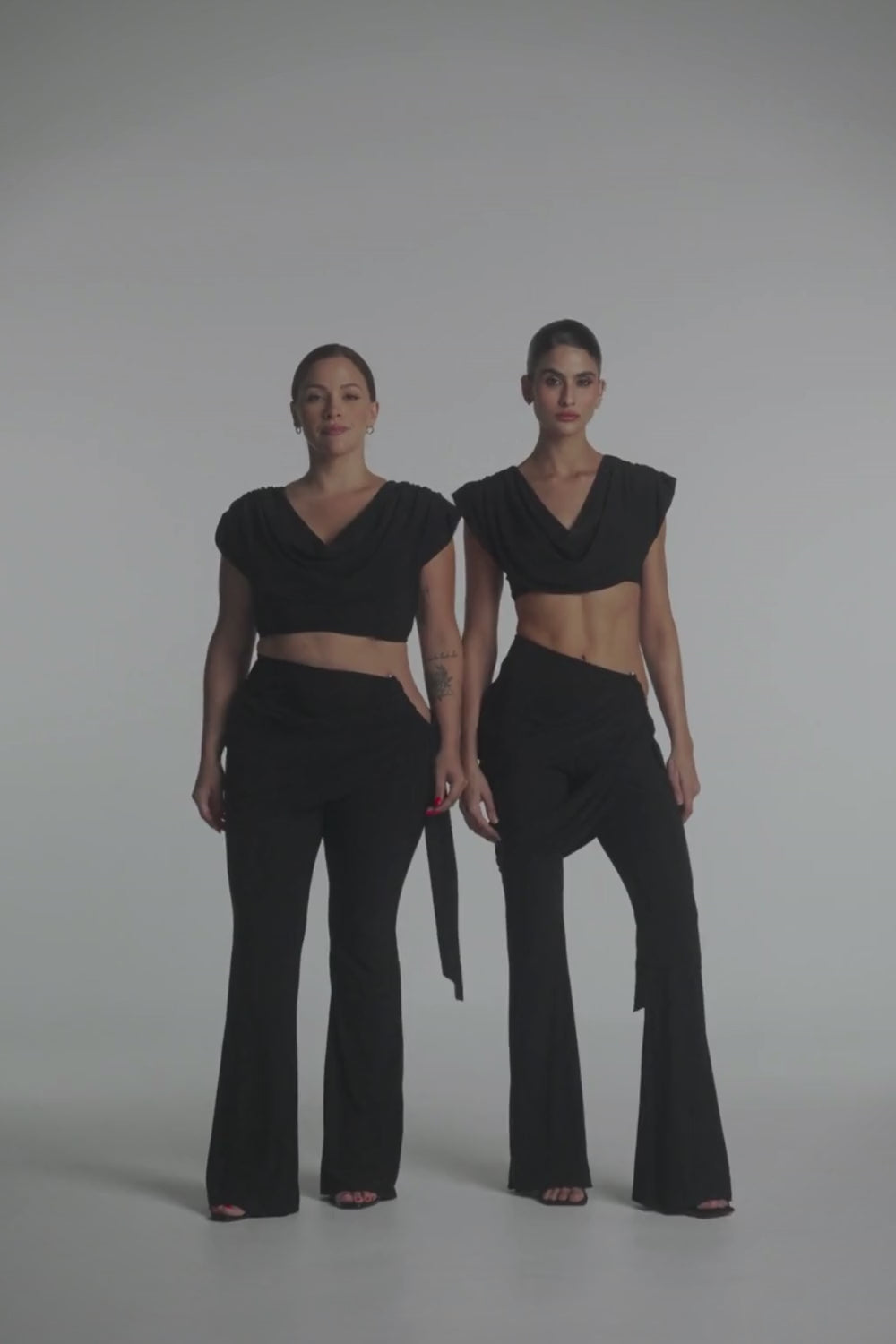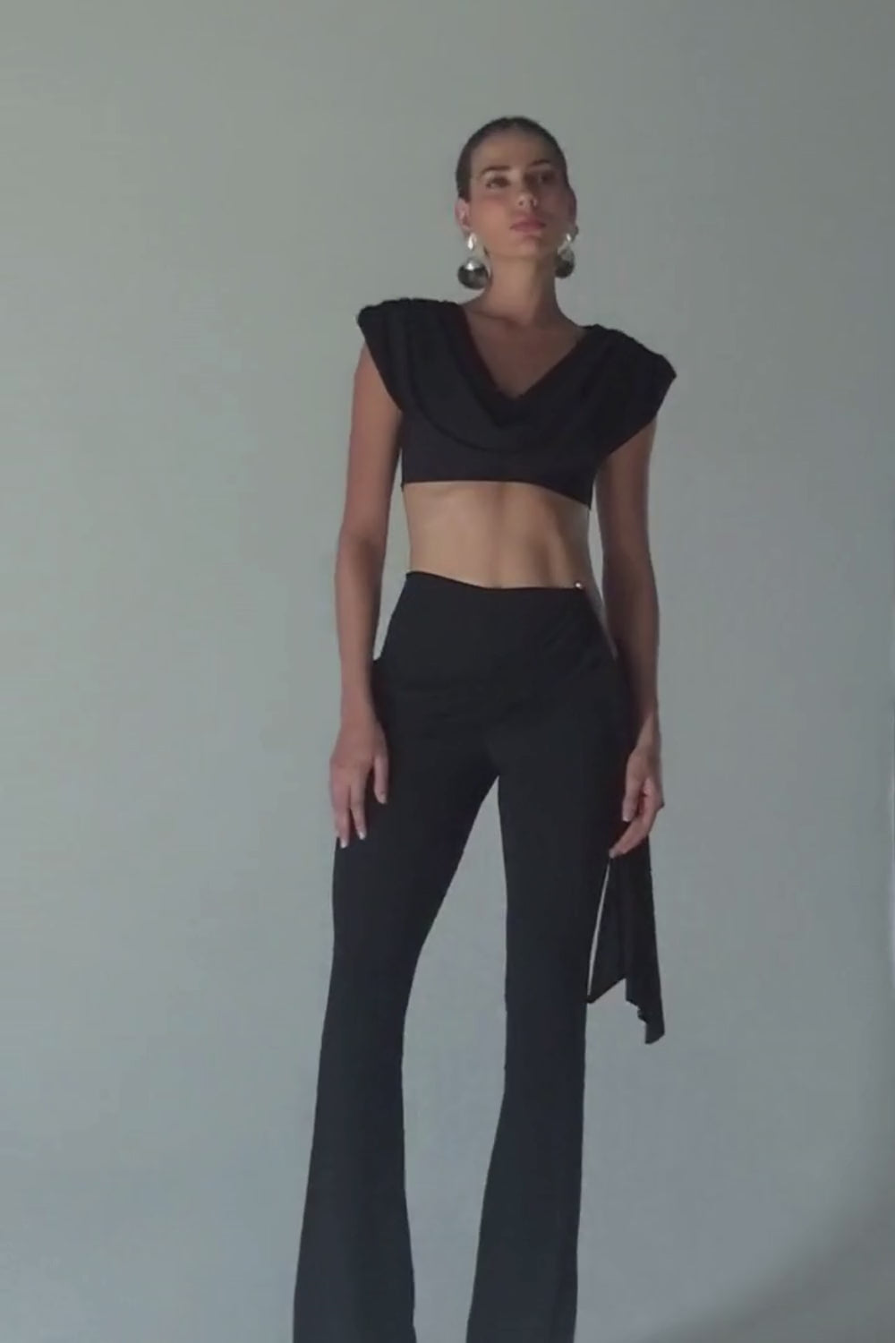 The flowing wide-leg pants create a striking silhouette. A seductive hip cutout adds a daring touch, perfectly complemented by the elegant draping across the hips.